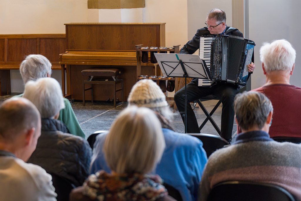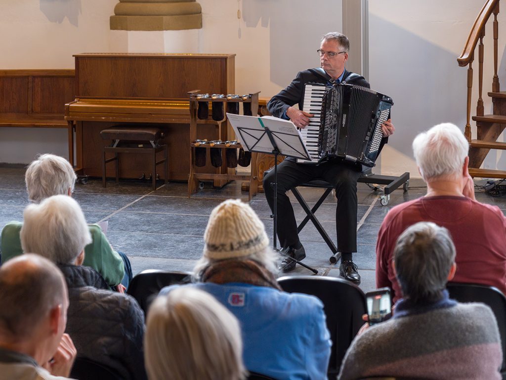 Eeuwe Zijlstra en Gertie Bruin brachten, op orgel en accordeon, muziek van de zestiende eeuw tot aan hedendaagse muziek van diverse componisten ten gehore. Beide instrumenten waren zorgvuldig, harmonieus afgestemd en kwamen prachtig tot hun recht in de akoestische ruimte van de kerk. Met delicaat gespeelde hoge tonen tot aan de haast bombastische lage tonen toverde Gertie met het stuk Melodia van de Japanse Toshio Hosokawa, adembenemende klanken tevoorschijn. De verschillende muziekstukken op orgel en accordeon drongen diep door bij het publiek. Al bij het eerste muziekstuk raakte het publiek sterk betrokken. In dit orgelwerk kwamen de tonen van het Fries Volkslied naar voren. Na het laatste nummer van het programma, kreeg het publiek nog een “toegift” waarbij beide instrumenten in een stuk van Piazolla samen speelden. Prachtig, vol en virtuoos.